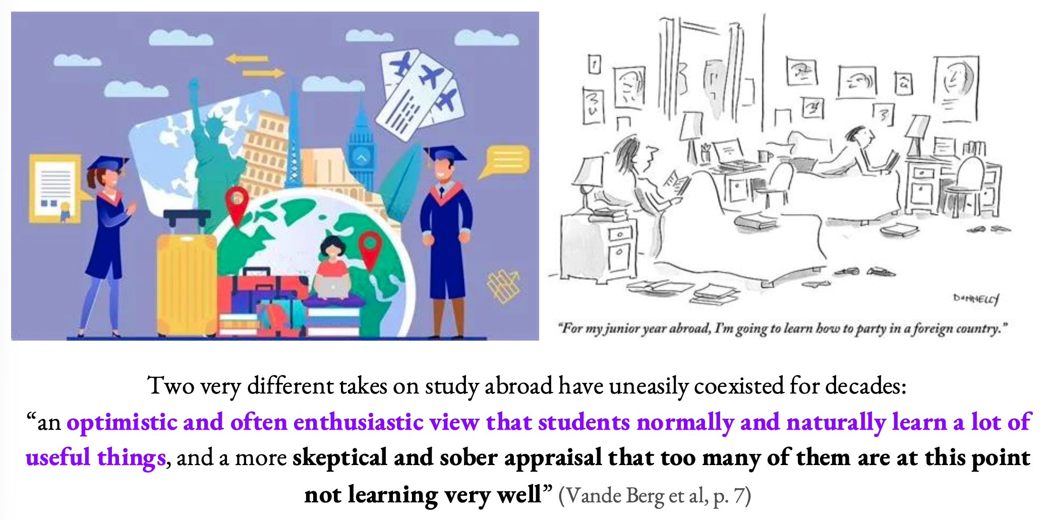 I began the discussion sharing two opposing views of study abroad that have existed for decades and that are summarized in Student Learning Abroad. What Our Student Are Learning, What They’re Not, and what We Can Do About It (Vande Berg et al, 2012 & 2023). On the one hand, there is a [perhaps overly] optimistic and enthusiastic view that the experience is “naturally transformative” and students learn and grow simply by being in this new location, almost as if by some sort of “osmosis” (I’ve found this to be common with students’ expectations of “language immersion”). On the other hand, critics are more skeptical and may soberly argue that many programs amount to little more than tourism, or even a vacation from serious studies. The authors pointed to the below New Yorker cartoon, which I included to represent this view (below, right). I suspect that many familiar with student abroad (as faculty leaders or student participants) may have seen or experienced both of these sides! When I created this program, I wanted to try to strike a balance between formal learning and education… and the potential transformative power of students’ so-called “free-time” or unstructured explorations of their environment outside of official academic channels. This is where the individualized research component for my “Spain Today” course came in.