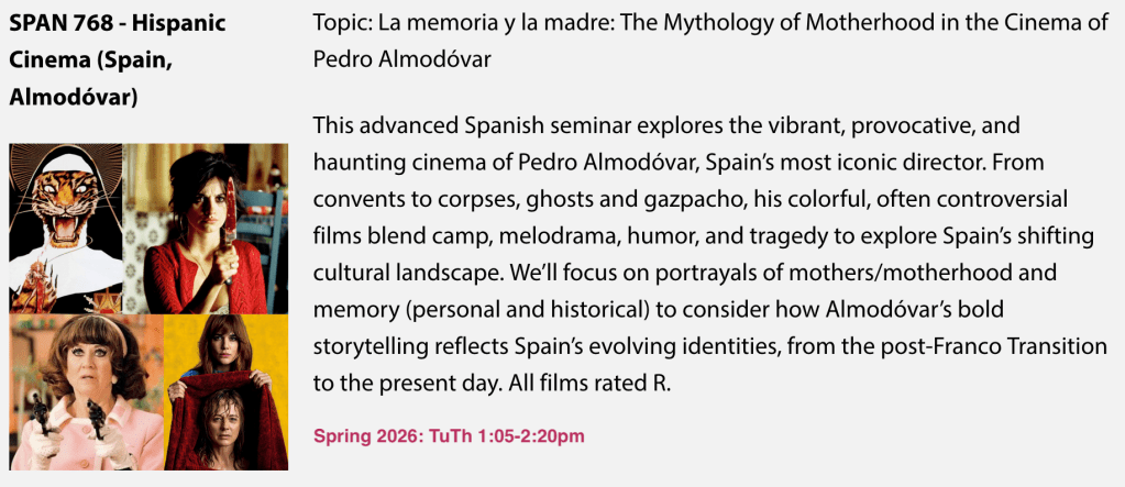 First post of 2026! This year my goal is to return to posting at least once per month (*fingers crossed*). This past August 2025 I returned to my role as Associate Professor of Spanish – and Director of Graduate Studies – after over 2 years as Interim Department Head (July 2022-August 2024), which was followed by a one year, long-awaited and postponed sabbatical (2024-2025). Since the fall, I’ve been enjoying teaching undergraduate classes again, especially my Almodóvar film class this semester, trying to preserve time for research and writing during the week, and continuing to plan and recruit students for this summer’s study abroad program in Spain — which will mark the 6th year (5th in a row!) that I’ll be taking students to Madrid and Pamplona for just over a month.