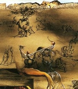 But for Dalí, the war was indeed a disturbing reality he could not ignore – his close friend, the poet and playwright Federico García Lorca, was murdered at the hands of the Nationalist militia in 1936. And while Dalí’s paintings may not appear to exhibit the same overt social commentary that is clearly visible in Picasso’s Guernica, I would disagree with Descharnes and Néret that the works themselves are apolitical. If we re-examine them, for example, in light of the aforementioned themes my class pointed out in Guernica, we find many – if not all – of the same techniques and representations. The surrealist style, bold colors, and unconventional imagery (and titles!) may mask the precise political and cultural realities, but we must not trivialize the way in which they nevertheless reveal the extent to which the death and destruction of this particular war affected even the most flippant, avant-garde, and typically irreverent of Spanish citizens.