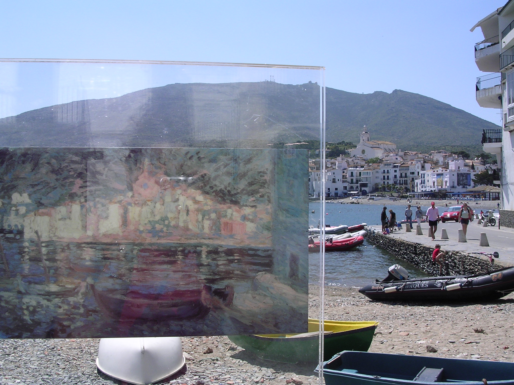 The second example below displays an impressionist-style painting of the picturesque village, the bay, and several fishing boats. If you look on the right-hand side of both the painting and my photograph, you can see the tall white building in the foreground of both images. This makes it apparent the way in which great care has been taken to display these pieces of art in the precise locations that inspired Dalí.