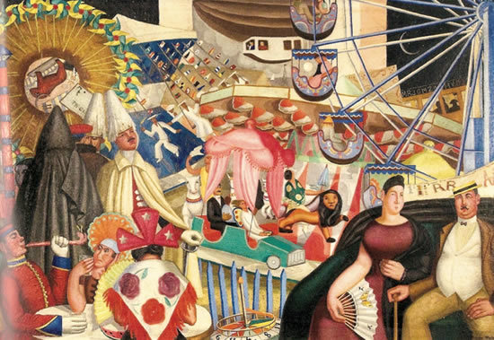 Today Mallo’s artwork is on display across Spain, in Paris, and in New York. Madrid’s Reina Sofia Museum houses “La verbena” (The Carnival, or The Street Fair), which is one of a four-part series of oil paintings exhibited in 1928 that was dedicated to capturing the chaotic, surreal, and often subversive atmosphere of Madrid’s open-air festivals. In this post I will discuss these four colorful paintings, particularly with regards to they way in which they defy the expectations and logic of Mallo’s contemporary Spanish society while exposing a multiplicity of sensations and perspectives on topics such as social class, religion, and the female form. I’ll draw much of my commentary from Shirley Mangini’s chapter published in the aforementioned Modernism and the Avant-garde Body in Spain and Italy, entitled “The Gendered Body Politic of Maruja Mallo” (pp. 151-173). Importantly, Mallo’s Verbena scenes contain subtle – and sometimes not-so-subtle – sociocultural criticism and satire. These transgressive elements were key components not only of Mallo’s artistic production and the Avant-garde in general, but of her notoriously iconoclastic personality that shattered taboos and challenged the validity of traditional beliefs, values, and practices. Below is the first Verbena, painted in 1927: