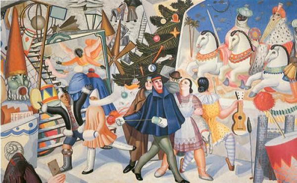 In Mallo’s “Verbena de Pascua” (Christmas Carnival) (below), two rather large women are again front and center, though this time they are not the focal point of the painting. Nevertheless, Mangini notes that their movements and appearance defy social mores, as their “corpulent female bodies prominently fill the space with their ungainly strides and short dresses” (159). Their dresses – a bit short for the time – imply that they are maids or servants, thus further placing their liberated public behavior at odds with the expectations of their subservient duties within a private space. The reversal, rejection, or interruption of traditional hierarchical structures, order, and law are key concepts of Carnaval, as Mikhail Bakhtin has pointed out. Curiously, Mallo’s Verbenas visually depict these same notions before they were popularized by Bakhtin, and both Mangini and Urioste point out that Mallo’s paintings are perfect pictorial representations of “el mundo al revés,” or “the world turned upside down”. With law and order suspended in Mallo’s worlds, all social classes and age groups share one public space; opposing concepts of the religious and the profane, high and low culture, and the exceptional and the insignificant coexist, and a parodic new image of contemporary society results (Urioste 205).