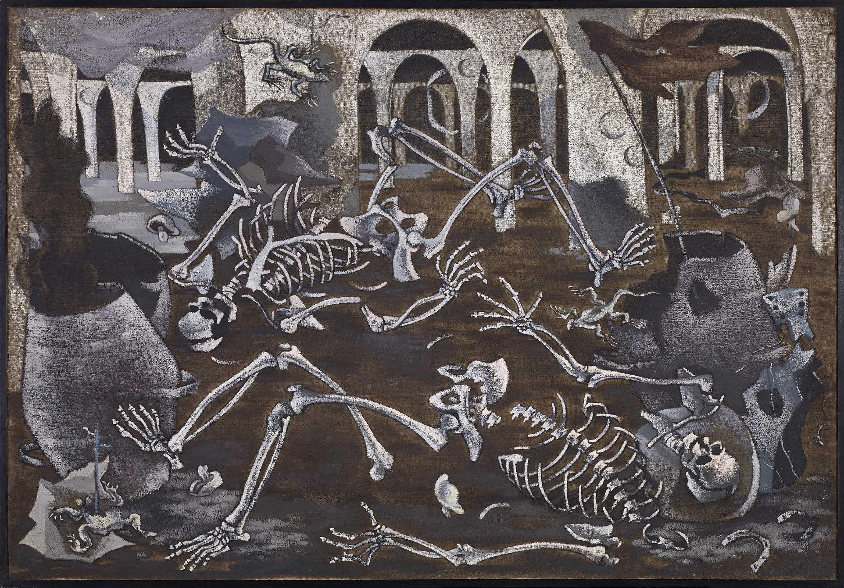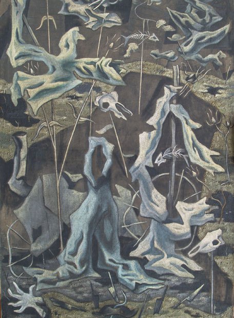 A second, very similar painting – Espantapeces (Fish Scarers, or Scarefishes), below – also formed part of Mallo’s Cloacas y campanarios (Sewers and Belfries) series. This “pathetic and startling sub-aquatic scenery, composed of strips and shreds of cloth, with ruminant skulls and knives stabbing the background” (Gandara 24), received several awards in Barcelona. Like Espantapájaros, Espantapeces presents shadowy, grotesque imagery that finds parallels in “Walking Around” – specifically Mallo’s skulls, animal skeletons, and cavernous underground setting mirror Neruda’s references to death, suffering, and a dark subterranean landscape:
