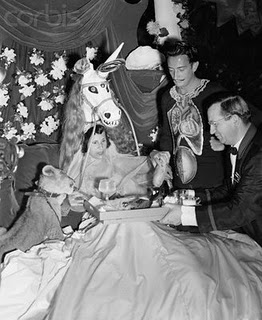 Transcript: Mr. Salvador Dalí gives a party. The Spanish painter of surrealism dresses Mrs. Dalí in a unicorn’s head – just to start things off. As hostess, she presides from a red velvet bed. The party is a benefit for refugee artists, and costumes are supposed to represent the guests’ bad dreams. Artist Dalí wears ear flaps, representing anatomy. A puzzled guest, Bob Hope, sees the fish course served in satin slippers… presumably the fish is sole. Soldier Jackie Coogan and Mr. Hope see the main course – the party is surrealism, but them frogs is real! [*Frogs begin to jump off Bob Hope’s dinner plate…*]