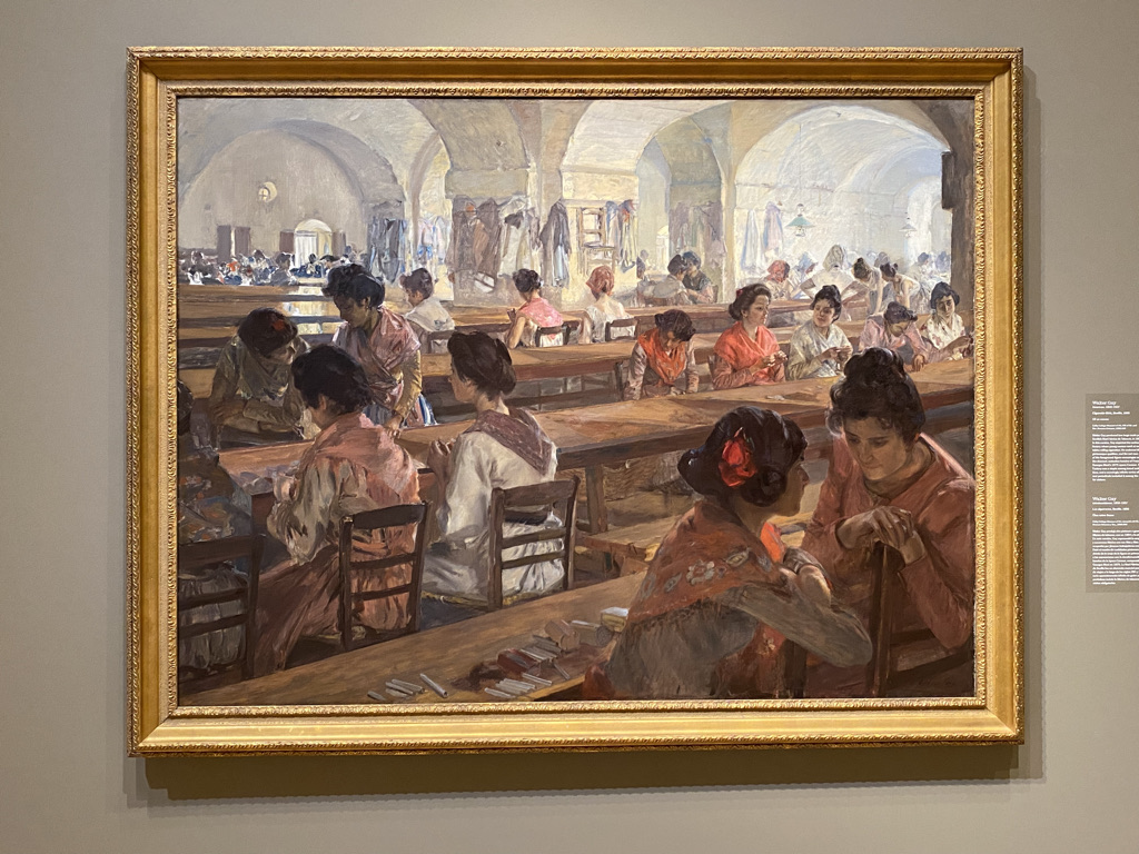 Reading this chapter – and given the painting that serves as the cover for Soria’s book (Las cigarerras by Gonzalez Bilbao Martínez, 1915, Sevilla) — I couldn’t help but recall the “Americans in Spain” exhibit from my visit the Milwaukee Museum of Art last summer (2021). Spanish cigarerras were a well-known figure outside the Tobacco Factories of Madrid’s and Sevilla’s modernizing urban landscapes. In fact, they served as artistic inspiration for foreign travelers to Spain, and especially for American painters like John Singer Sargent and Walter Gay in the late 19th-century. Like Walter Gay’s painting (below) of these women working in the cigarette factory — and even the Spaniard Bilbao Martínez’s, to some extent — foreign artists and writers viewed labor performed by the “charming and colorful” Spanish working classes “in the most picturesque terms, as preindustrial and romantic, the antithesis of factories and mass production in the rest of western Europe and the US” (75). The female cigarerras were the epitome of this, as outsiders exoticized both their femininity and “Spanishness”.